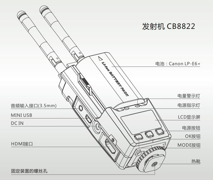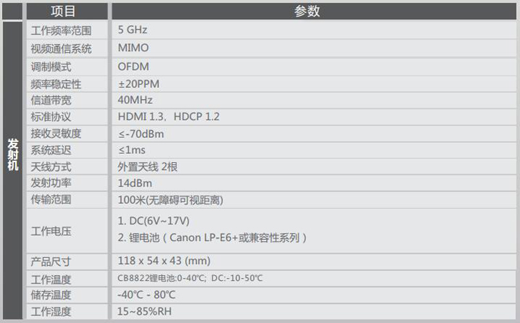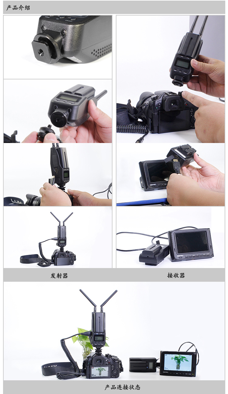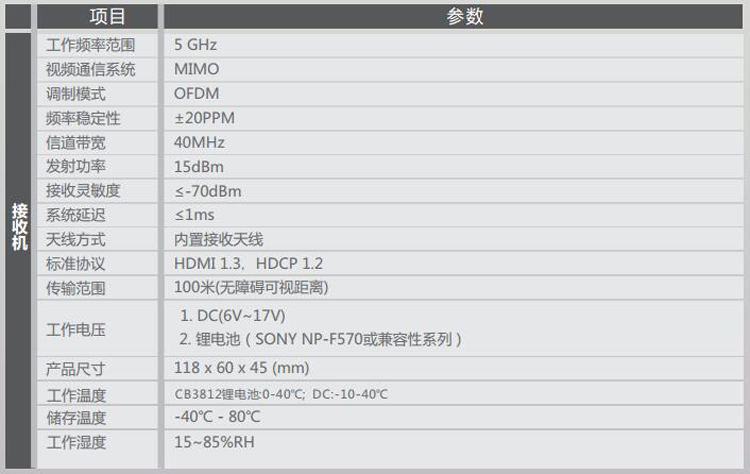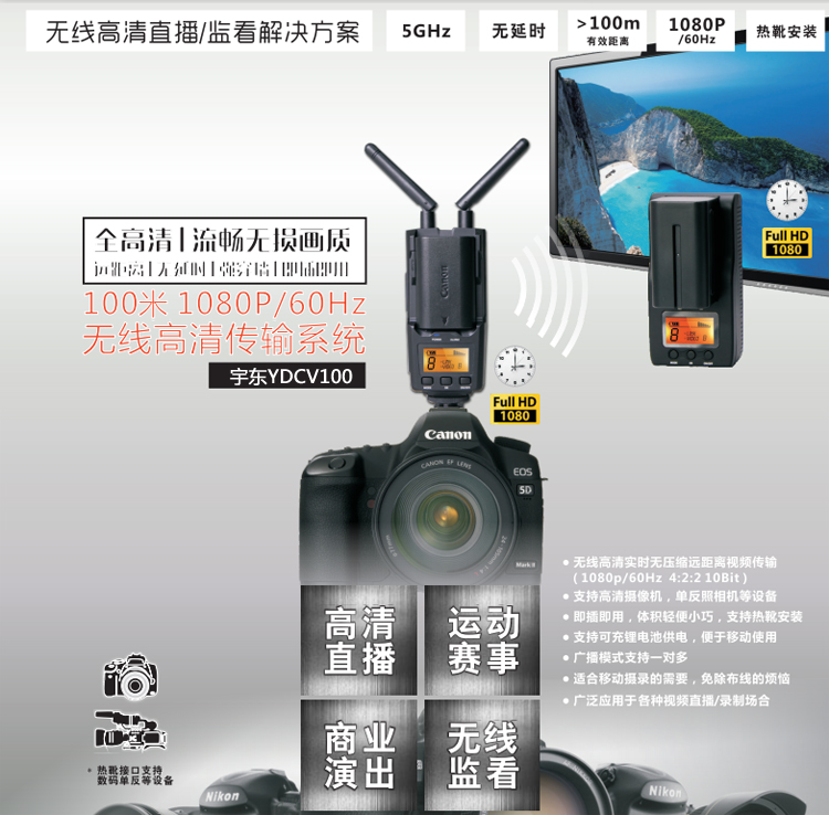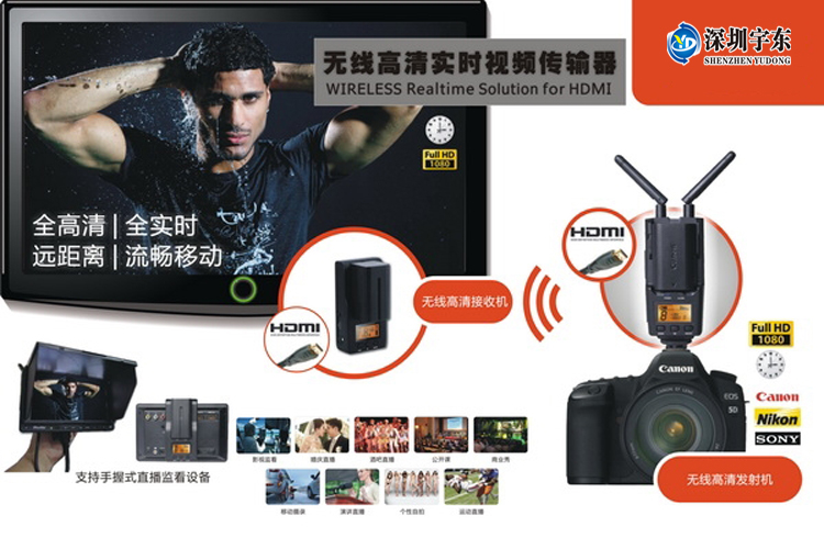 100米HDMI無(wú)線(xiàn)高清視頻傳輸器 HDMI 100米無(wú)線(xiàn)傳輸器 拍電影專(zhuān)用 適用攝像機(jī)、照相機(jī)等帶有HDMI輸出的便攜高清視頻設(shè)備; -支持DC供電(電源適配器12V、寬電壓范圍的應(yīng)急電源(6V~17V)或安裝鋰電池 (SONY NP-F570/F750/Canon LP-E6+及兼容系列電池)供電,內(nèi)部有防止電源范姐的保護(hù)設(shè)計(jì); -正面結(jié)構(gòu)為鋰電池卡座,用來(lái)安裝SONY。 隨著高清影視設(shè)備越來(lái)越廣泛的應(yīng)用,其布線(xiàn)過(guò)程中也出現(xiàn)了多方面的問(wèn)題,如線(xiàn)材成本較高,使用壽命短,如果現(xiàn)場(chǎng)保護(hù)不夠,路過(guò)人群的踩踏可能影響線(xiàn)材表現(xiàn),甚至引發(fā)直播事故。本方案為影視直播場(chǎng)景提供了更加便捷安全的解決方案,其遠(yuǎn)距離傳輸多頻點(diǎn)支持配合大容量鋰電池系統(tǒng),即插即用設(shè)置,能充分的滿(mǎn)足各種室內(nèi)外拍攝需求,尤其是免布線(xiàn)的特點(diǎn),將帶給您更安全,更便利的專(zhuān)業(yè)體驗(yàn)。