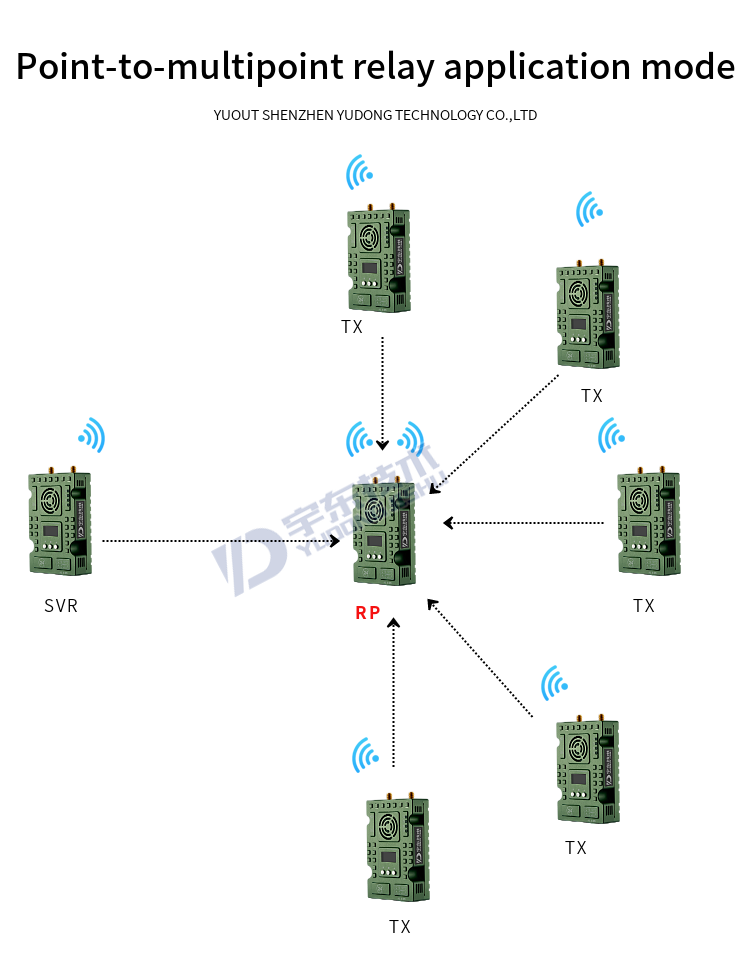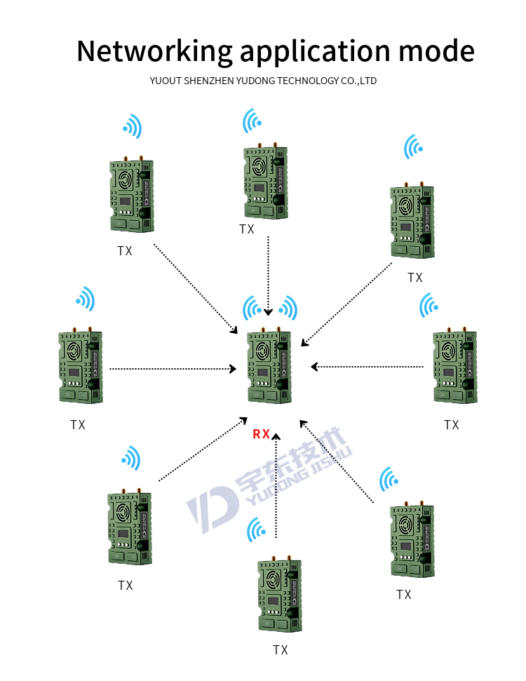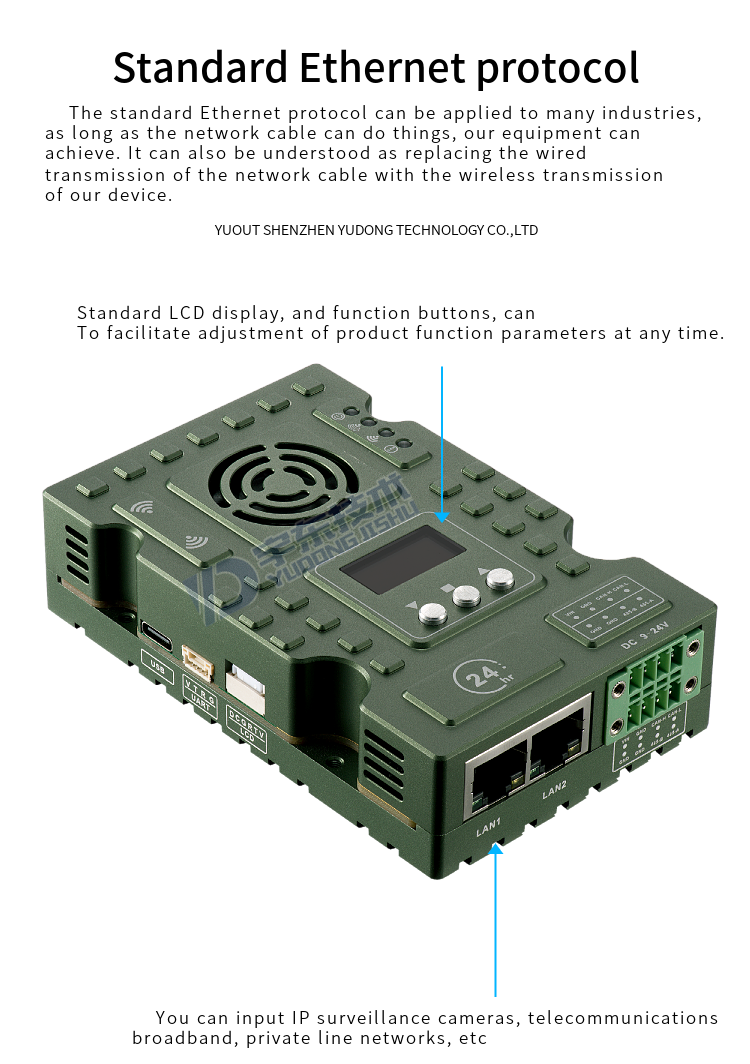 YD-TD9008-DT wireless broadband transmission radio adopts industrial-grade wireless high-speed data transmission technology, non-line-of-sight, non-wifi, set orthogonal frequency division multiplexing TDMA and MIMO multi-input and multiple-output capacity technology, completely based on IP Internet protocol, to achieve full bidirectional transparent channel broadband transmission. Non-visual distance: 300-900 meters; Ground visual distance: 2-18 km. The system is pure hardware connection, plug and play; Innovative LCD integrated design, rich CAN bus, RS-485, TTL level interface, better user perspective experience. The channel supports a maximum of 30Mbps of swallowing and spitting, and can be widely used in industrial automation, industrial robots, drones and other communication work.