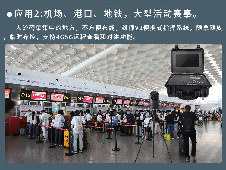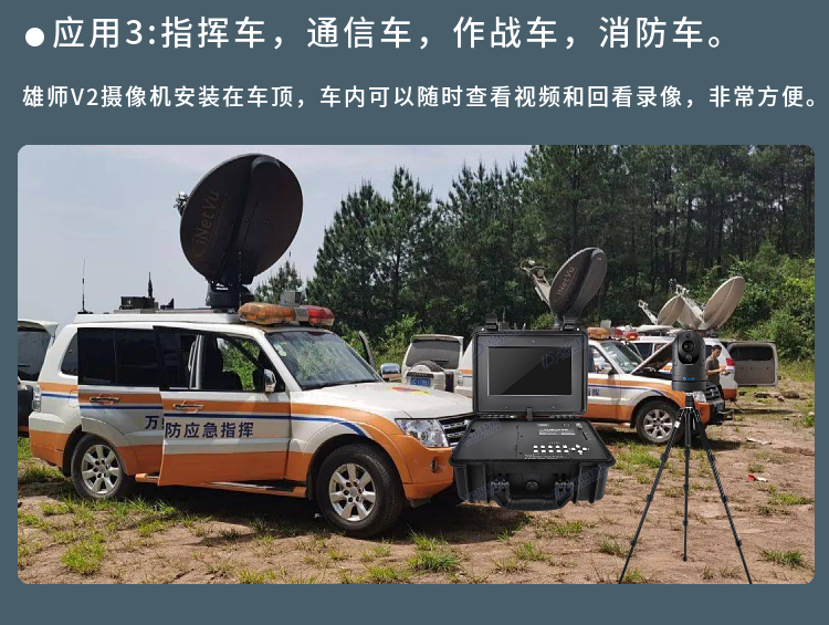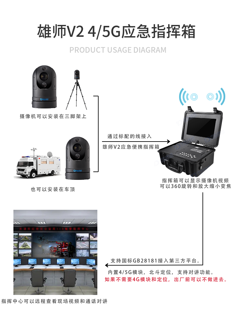 雄師V2 4/5G高清應急便攜指揮箱是一款功能全面、攜帶方便的無線視頻指揮一體化產品,超高設備集成度,內置高性能鋰電池組,具備防水防震等特性的應急指揮箱,可滿足臨時布控和快速安裝的特殊要求。執行任務時可快速將設備臨時安放在需要監控的位置或直接吸附在車輛上,任務結束時可方便將設備拆下,適用于外勤執法、偵查布控、安防安保、應急指揮、搶險搶修、巡線管理等行業應用,比如公安、交警、消防、路政、城管、交通、法院、監獄、林業、電力、水利、環保等單位。為用戶提供高清、流暢、穩定的視頻效果,能實現北斗定位、遠程視頻查看、雙向語音對講、錄像保存回看等功能。“聽得到、看得見”是針對突發緊急事件的一整套應急指揮設備,為實現應急指揮的“通信暢通、現場及時、數據完備、指揮到位”提供技術保障,可廣泛應用于應急指揮、公安、刑偵、交巡警、消防、部隊、人防應急、邊防、城管、電力、路政等領域。